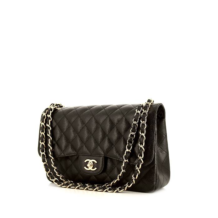 Indémodable sac à main Chanel Timeless jumbo en cuir grainé matelassé noir, garniture en métal doré, anse-chaine en métal doré entrelacée de cuir noir permettant un porté main ou épaule ou bandoulière.