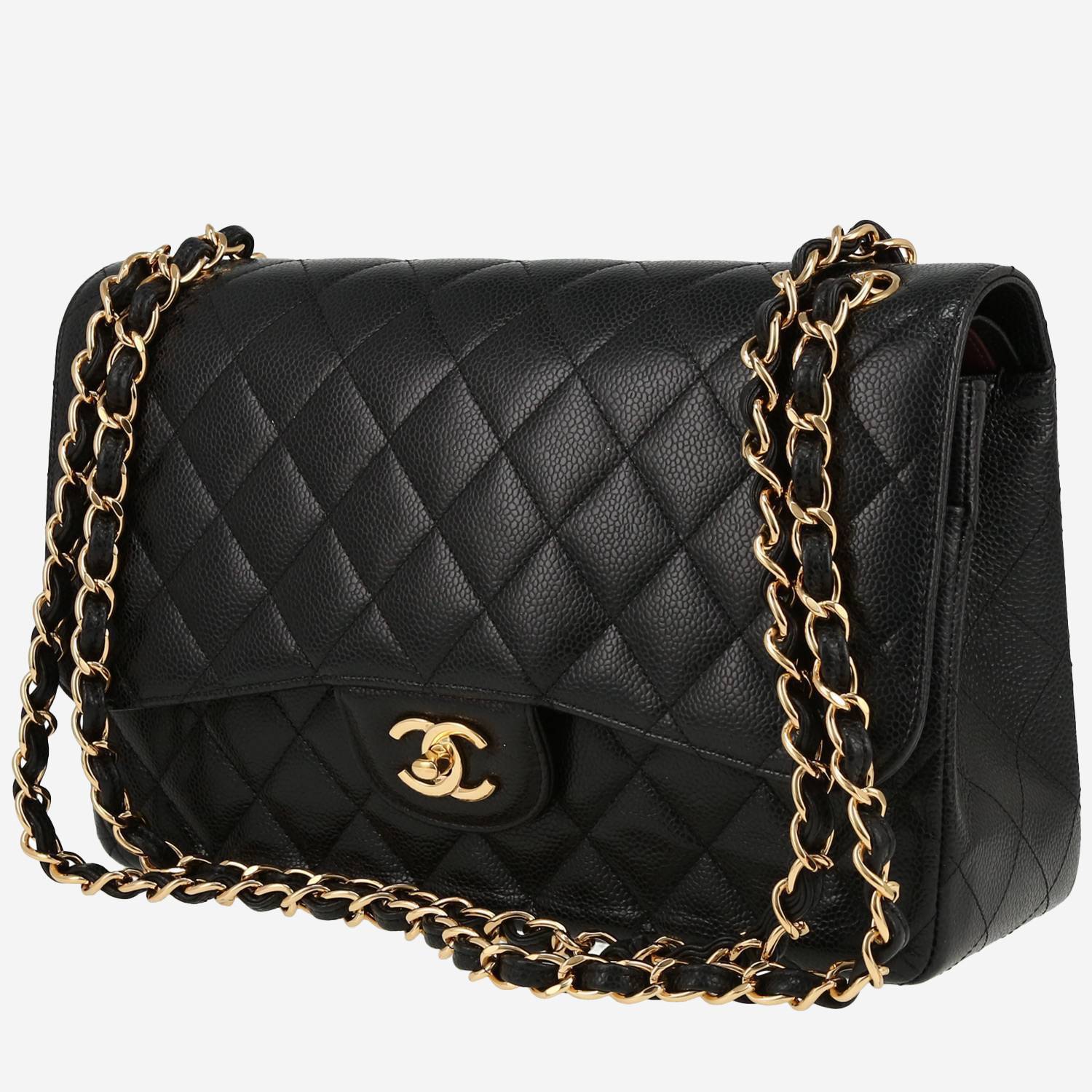 Splendide sac à main Chanel Timeless Jumbo en cuir grainé matelassé noir, garniture en métal doré, une anse-chaine transformable en métal doré entrelacée de cuir noir permettant un porté main ou épaule ou bandoulière.
