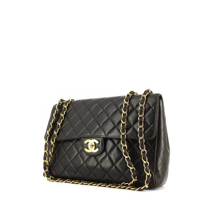 Charmant sac à main "Timeless jumbo" en cuir matelassé noir, anse-chaine en métal doré entrelacée de cuir noir permettant un porté main ou épaule.