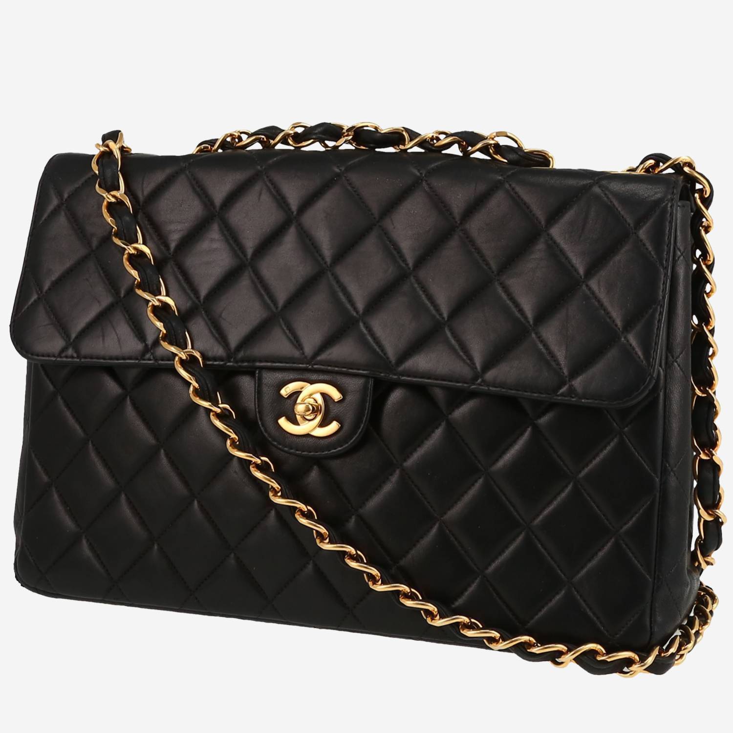 Splendide sac à main Chanel Timeless Jumbo en cuir matelassé noir, garniture en métal doré, anse-chaine en métal doré entrelacée de cuir noir permettant un porté main ou épaule ou bandoulière.