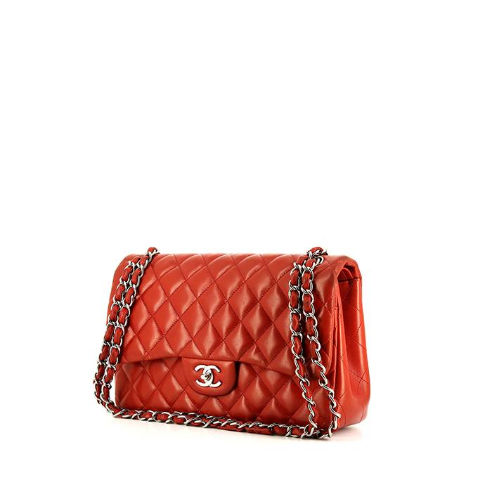 Superbe sac à main Chanel Timeless jumbo en cuir matelassé rouge, garniture en métal argenté, anse-chaine en métal argenté entrelacée de cuir rouge permettant un porté main ou épaule ou bandoulière.