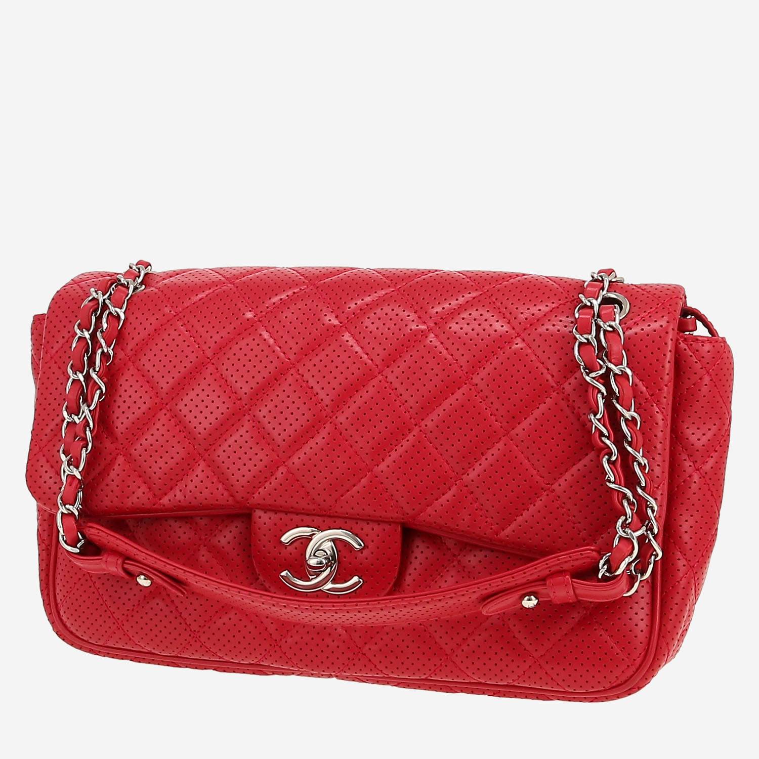 Élégant sac à main Chanel Timeless Jumbo en cuir matelassé rouge à motif perforé, garniture en métal argenté, une anse-chaine en métal argenté entrelacée de cuir rouge permettant un porté main ou épaule.