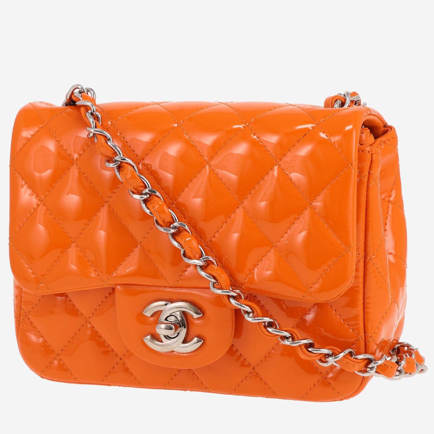 Ravissant sac bandoulière Chanel Mini Carré en cuir verni matelassé orange, garniture en métal argenté, une anse-chaine en métal argenté entrelacée de cuir orange permettant un porté épaule ou bandoulière.