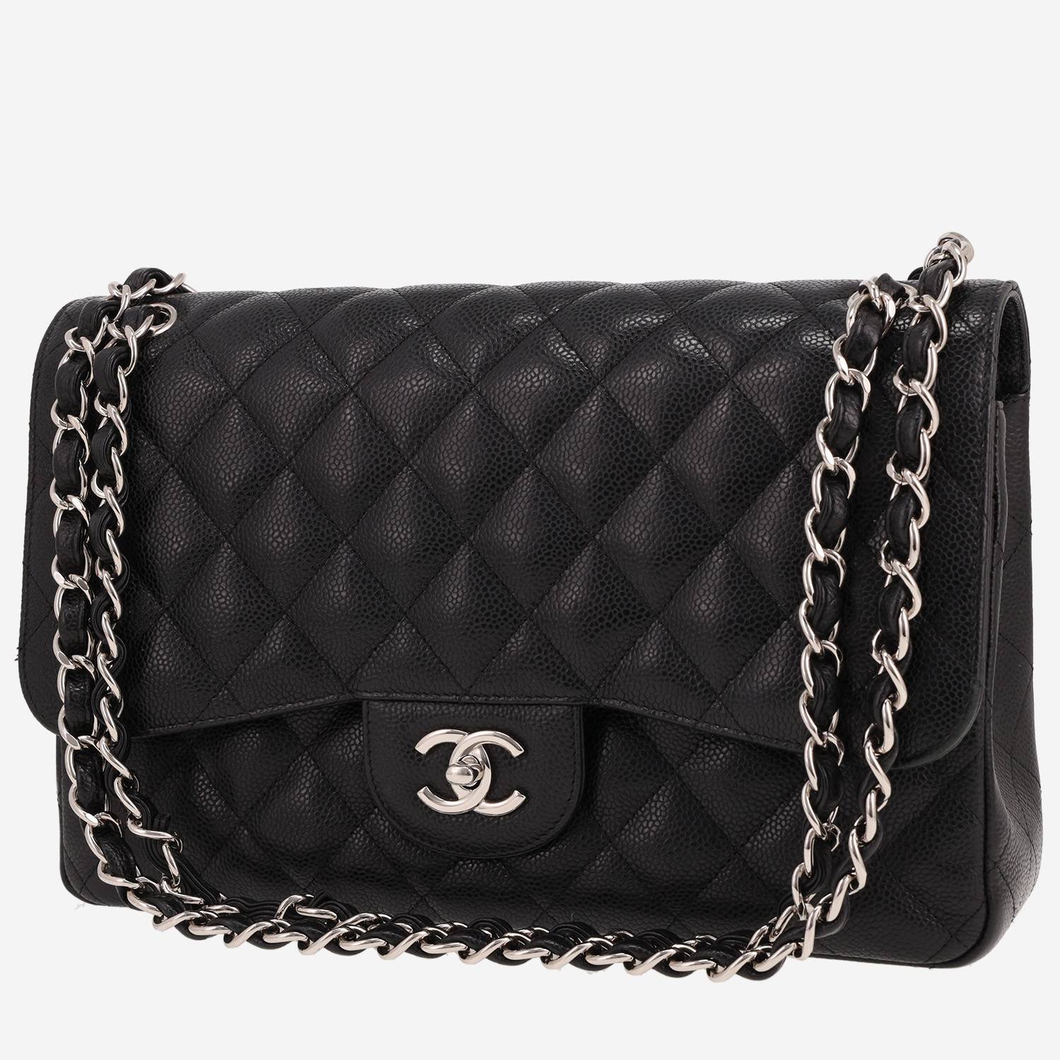 Magnifique sac bandoulière Chanel Timeless Jumbo en cuir grainé matelassé noir, garniture en métal argenté, une anse-chaine transformable en métal argenté entrelacée de cuir noir permettant un porté main ou épaule ou bandoulière.