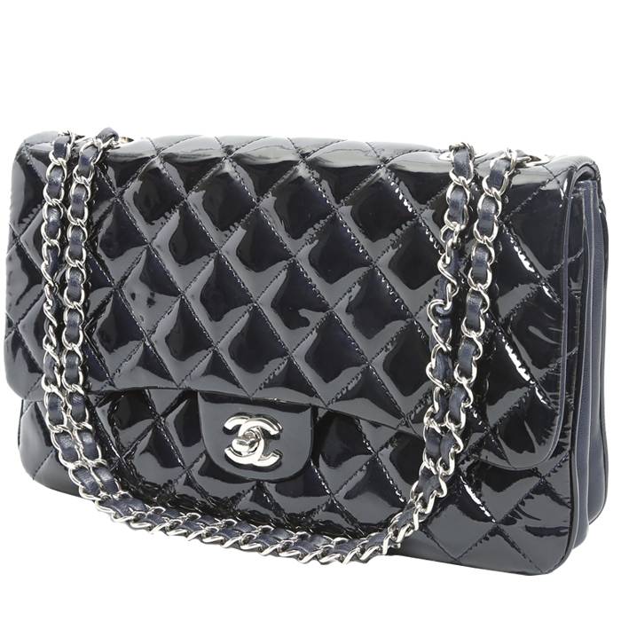 Incontournable sac bandoulière Chanel Timeless Jumbo en cuir verni matelassé bleu-marine, garniture en métal argenté, anse-chaine en métal argenté entrelacée de cuir bleu-marine permettant un porté main ou épaule ou bandoulière.