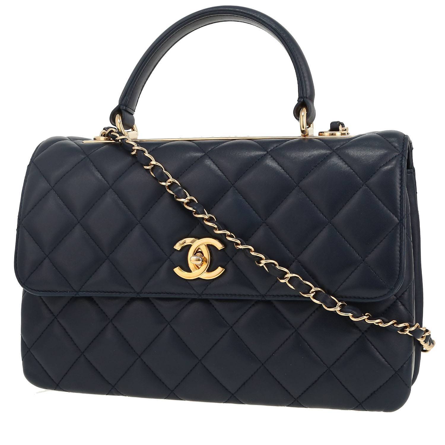 Magnifique sac bandoulière Chanel Trendy CC en cuir matelassé bleu-marine, garniture en métal doré, poignée simple en cuir bleu-marine, une anse-chaine amovible en métal doré entrelacée de cuir bleu-marine permettant un porté main ou épaule ou bandoulière.