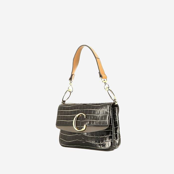 Élégant sac à main Chloé C en cuir noir imitation crocodile, garniture en métal doré, une anse simple en cuir gold permettant un porté main ou épaule.