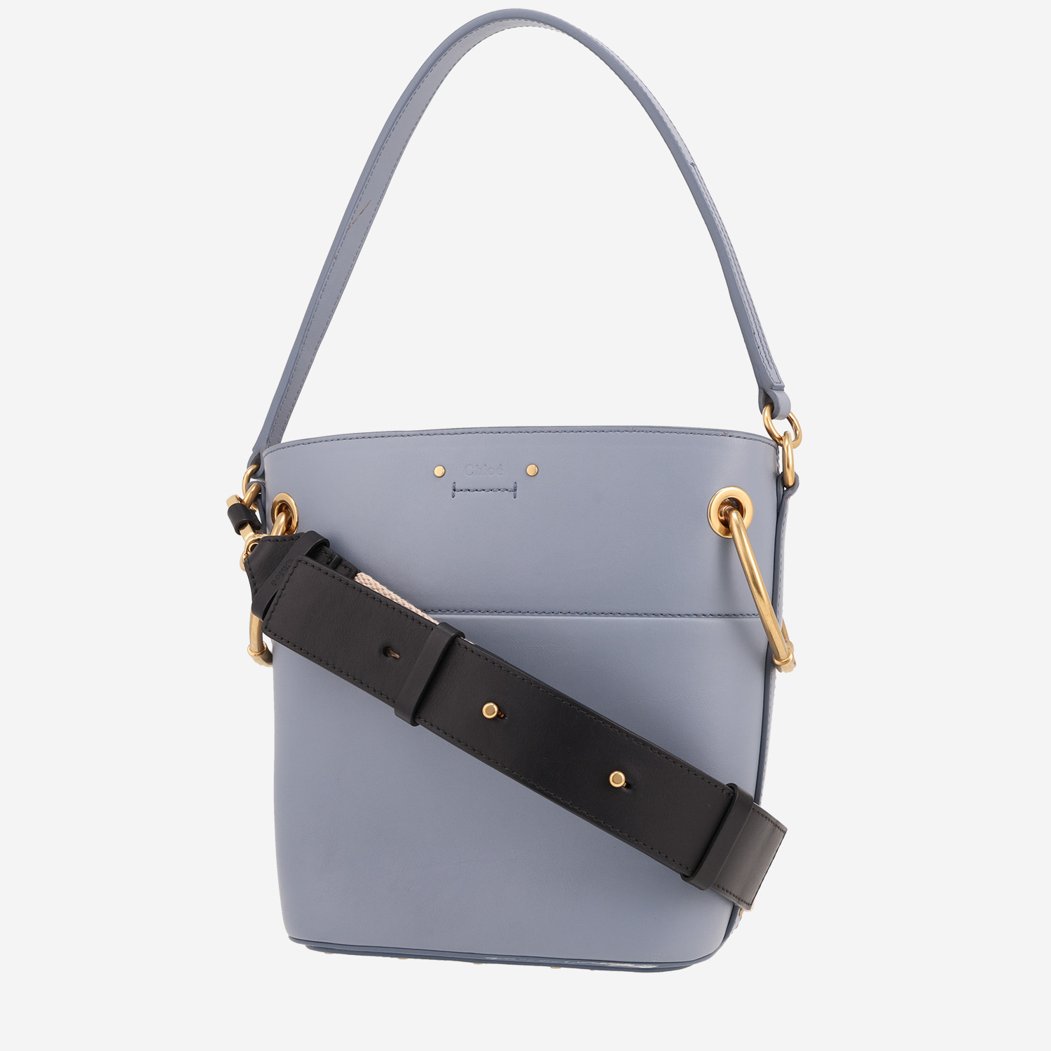 Charmant sac bandoulière Chloé Roy en cuir bleu, garniture en métal doré, anse simple en cuir bleu, anse bandoulière amovible réglable en toile et cuir bicolore permettant un porté main ou épaule.