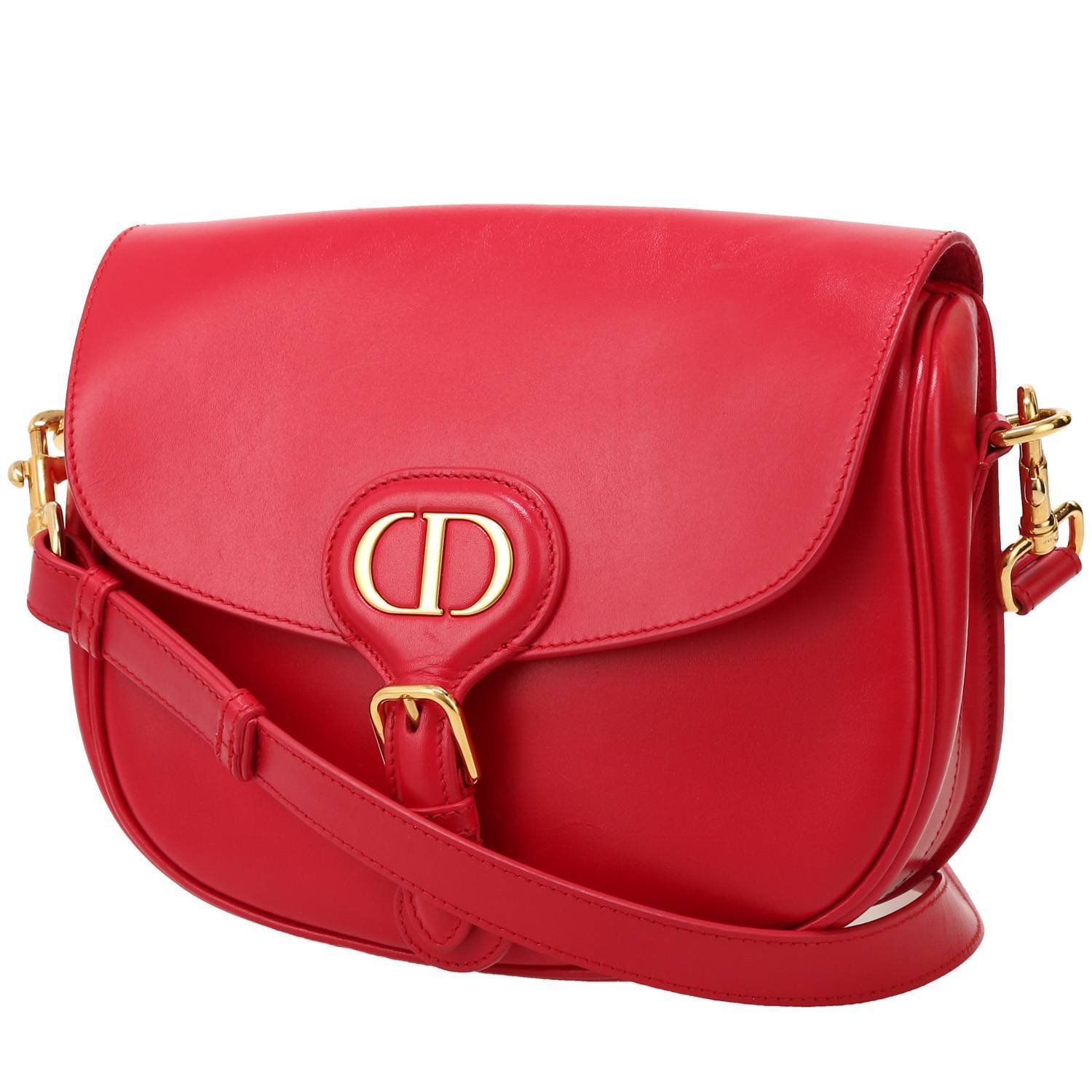 Chic sac bandoulière Dior Bobby en cuir rouge, garniture en métal doré, anse bandoulière amovible réglable en cuir rouge permettant un porté épaule ou bandoulière.