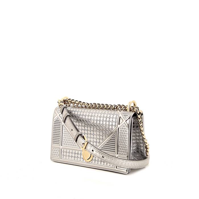 Ravissant sac bandoulière Dior Diorama en cuir argenté à motif, garniture en métal doré, une anse-chaine en métal doré permettant un porté épaule ou bandoulière.