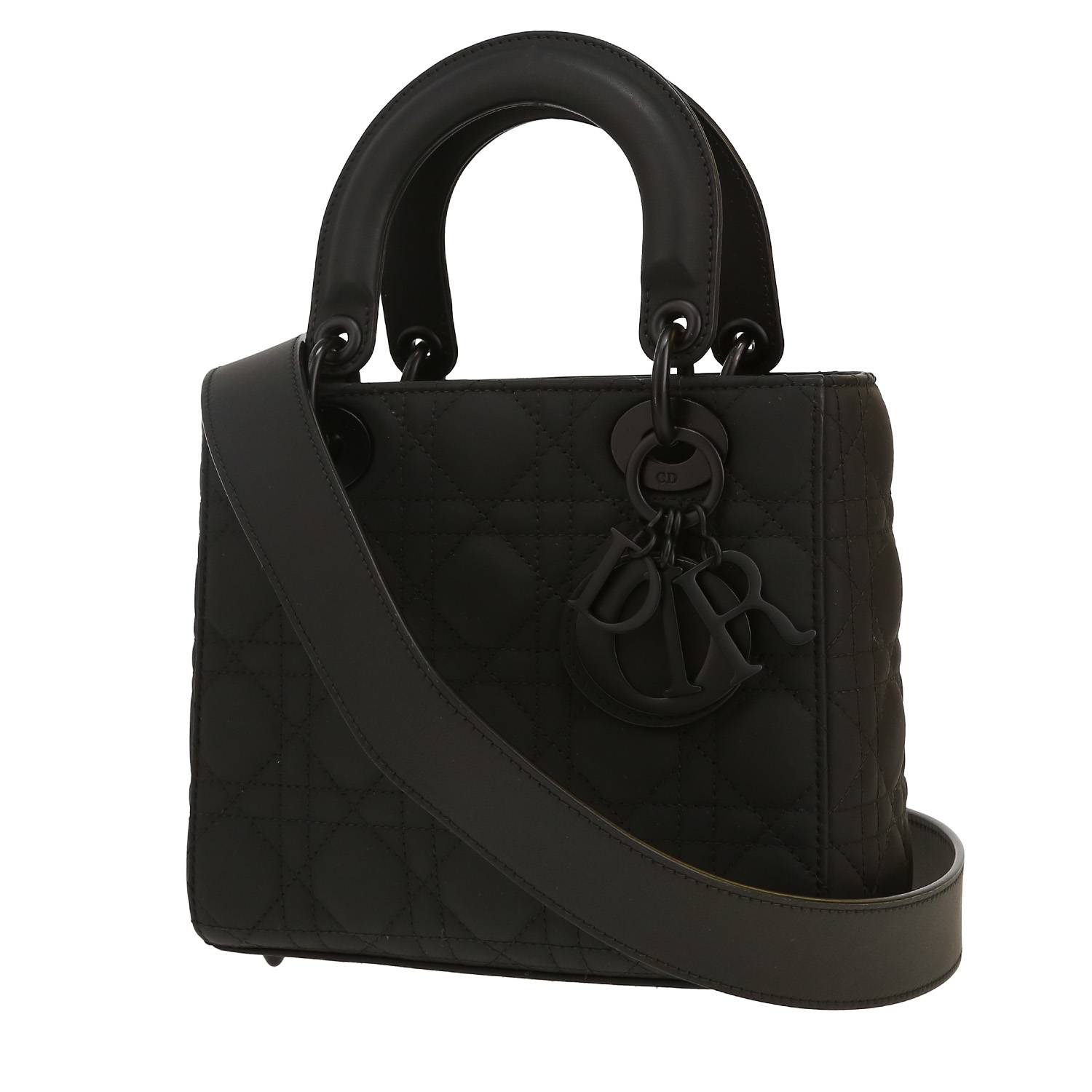 Incontournable sac à main Dior Lady Dior en cuir cannage noir, garniture en métal noirci, double poignée en cuir noir, anse bandoulière amovible en cuir noir permettant un porté main ou épaule ou bandoulière.