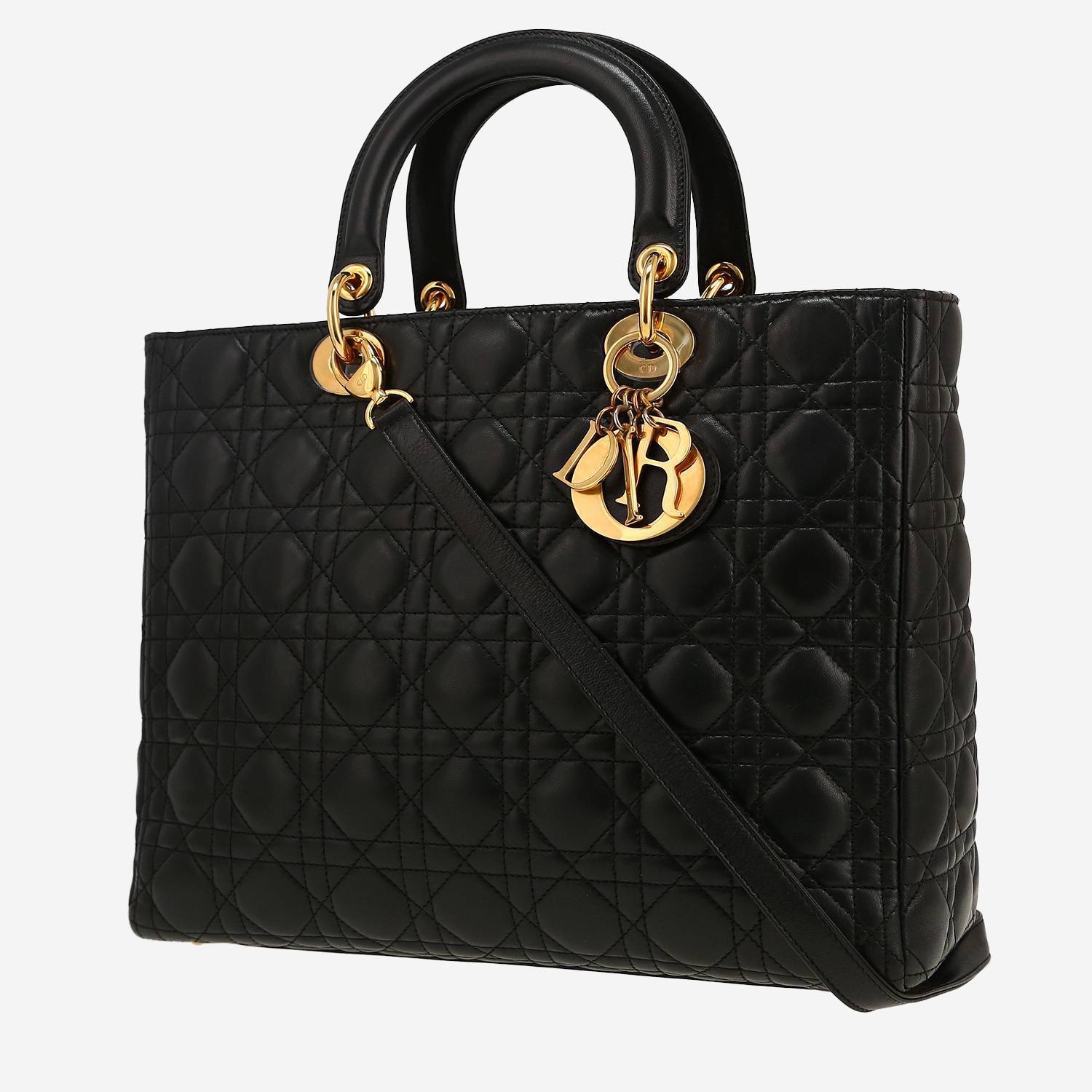 Incontournable sac à main Dior Lady Dior grand modèle en cuir cannage noir, garniture en métal doré, double poignée en cuir noir, anse bandoulière amovible en cuir noir permettant un porté main ou épaule ou bandoulière.