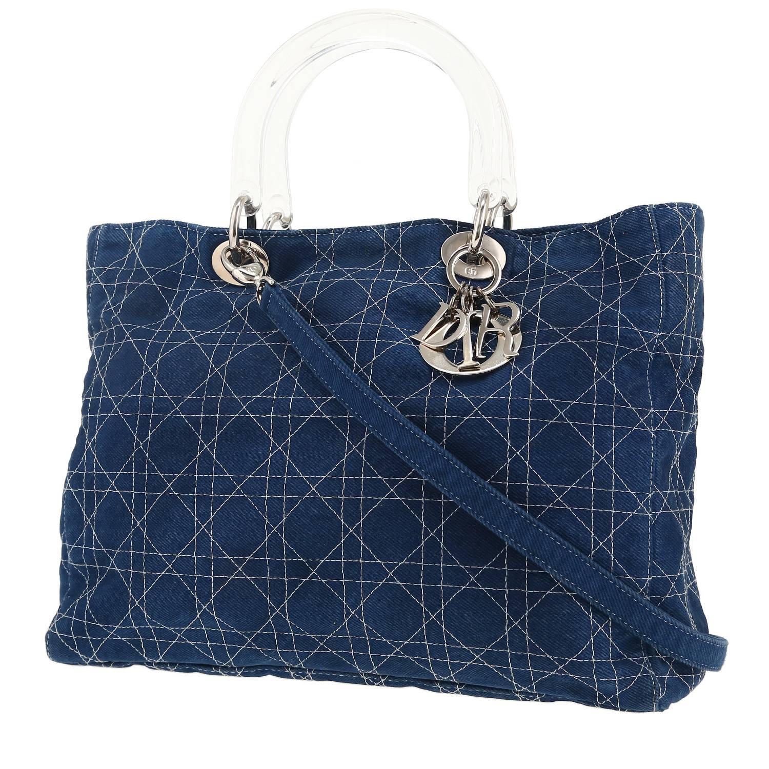Magnifique sac à main Dior Lady Dior en toile denim bleu cannage, garniture en métal argenté, double poignée en plexiglas, anse bandoulière amovible en toile denim bleue permettant un porté main ou épaule.