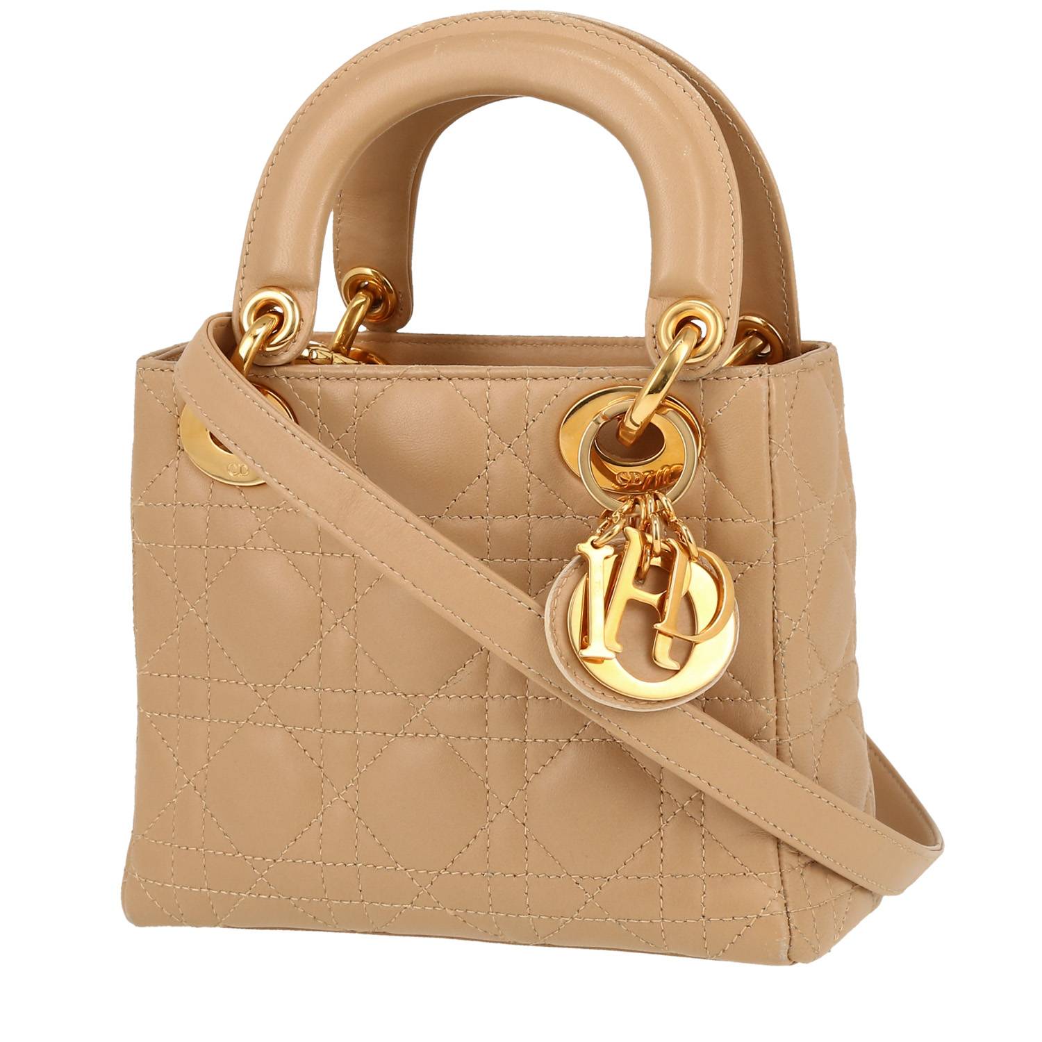 Incontournable sac à main Dior Lady Dior mini en cuir cannage beige, garniture en métal doré, double poignée en cuir beige, anse bandoulière amovible en cuir beige permettant un porté main ou épaule ou bandoulière.
