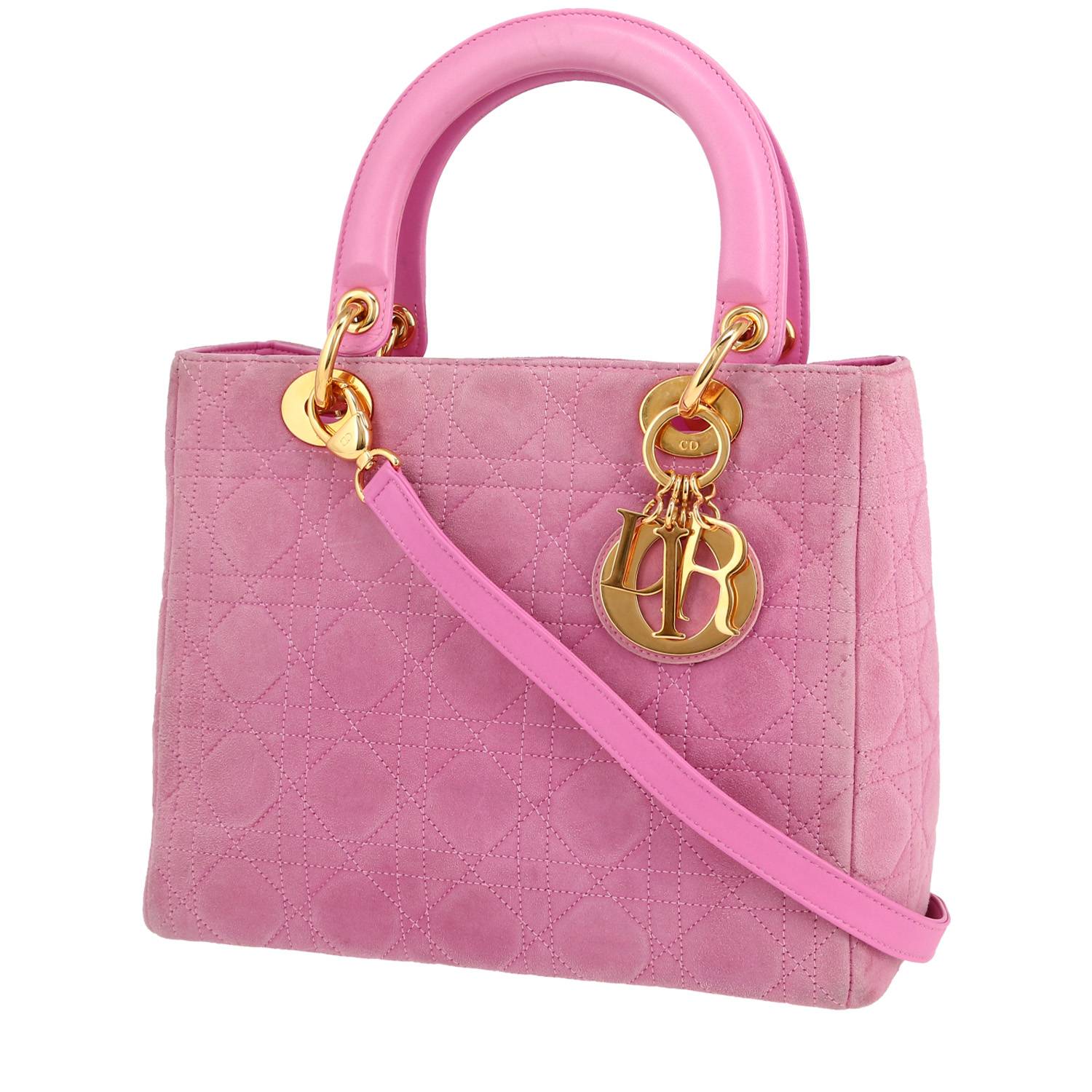 Incontournable sac à main Dior Lady Dior moyen modèle en daim rose et cuir rose, garniture en métal doré, double poignée en cuir rose, une anse simple amovible en cuir rose permettant un porté main ou épaule.