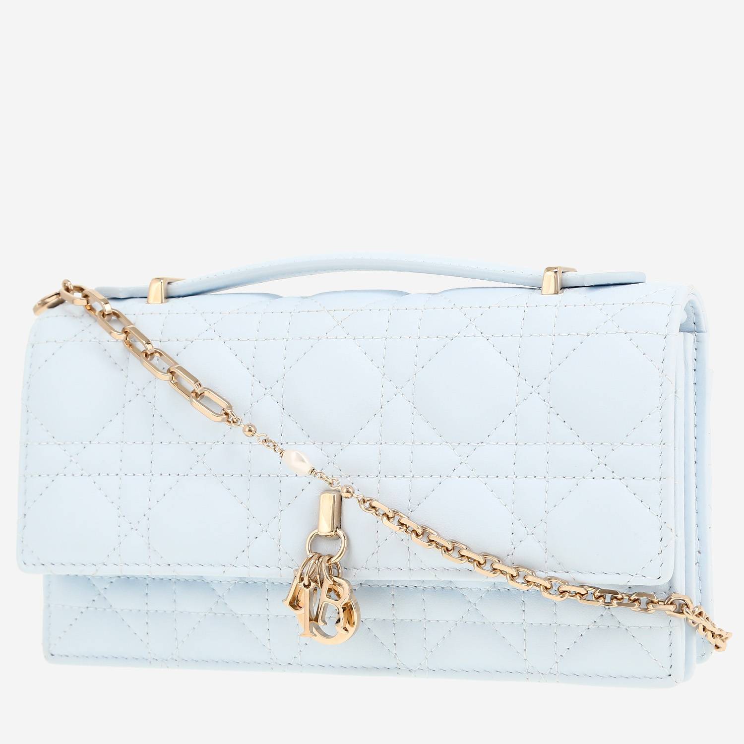 Charmant sac/pochette Dior My Dior Pouch en cuir cannage bleu, garniture en métal doré, poignée en cuir bleu, anse bandoulière en métal doré permettant un porté main ou épaule ou bandoulière.