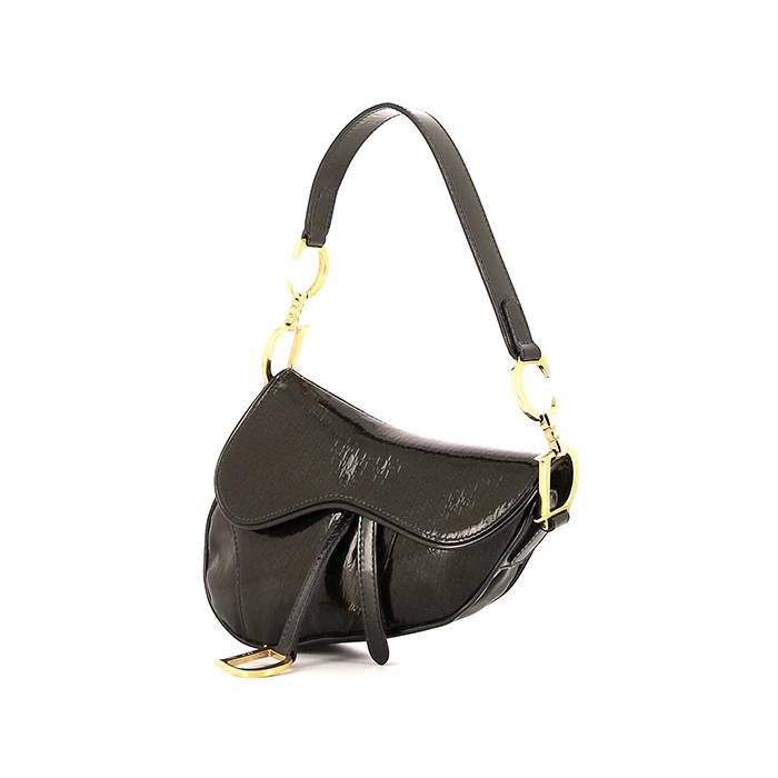 Superbe sac à main Dior Saddle en cuir vernis monogram vert-foncé, garniture en métal doré, poignée simple en cuir vernis vert-foncé permettant un porté main ou épaule.