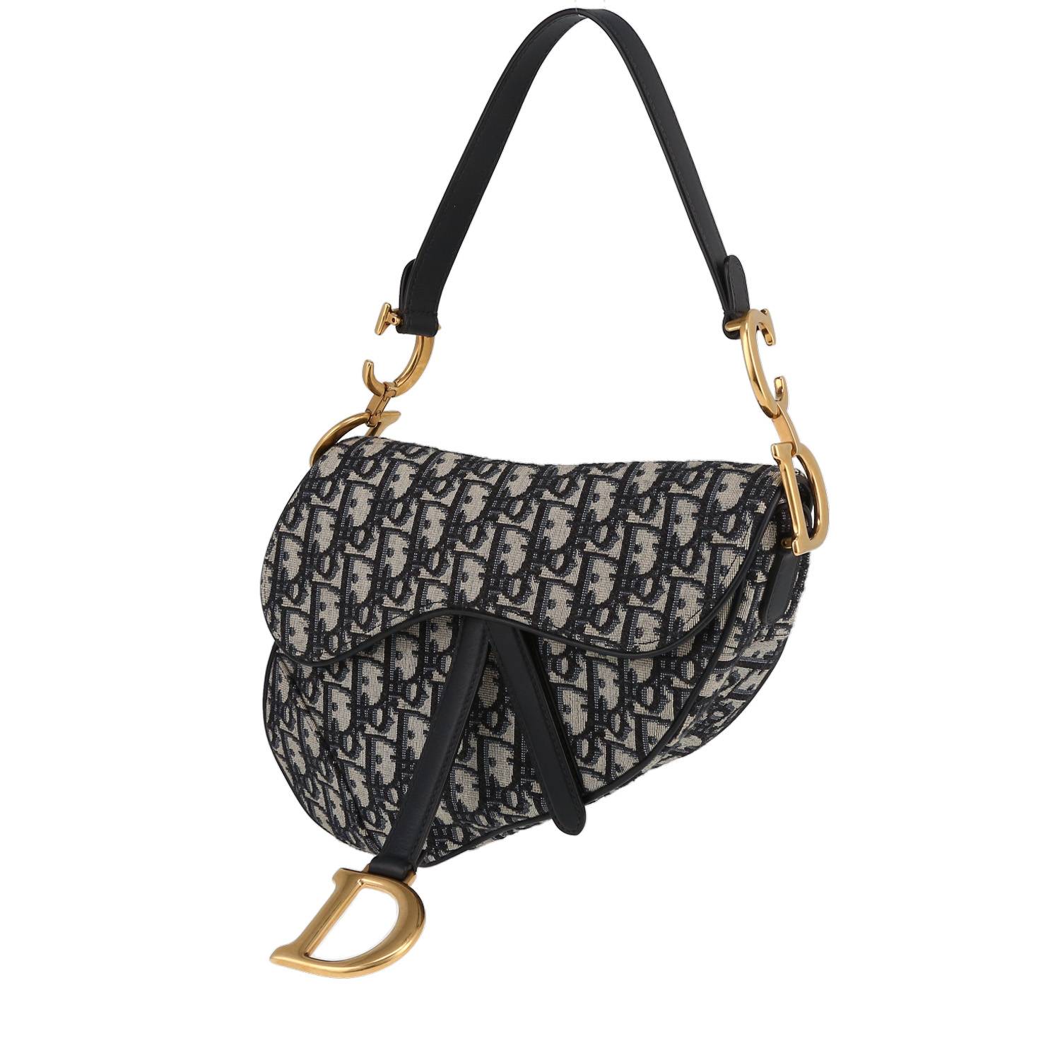 Incontournable sac à main Dior Saddle en toile monogram Oblique bleu-marine et cuir bleu-marine, garniture en métal doré, une anse en cuir bleu-marine permettant un porté main ou épaule.