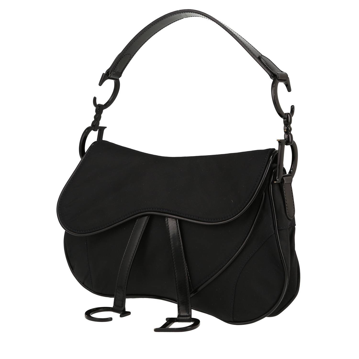 Joli sac à main Dior Saddle en toile noir et cuir noir, garniture en métal noirci, poignée simple en cuir noir permettant un porté main ou épaule.