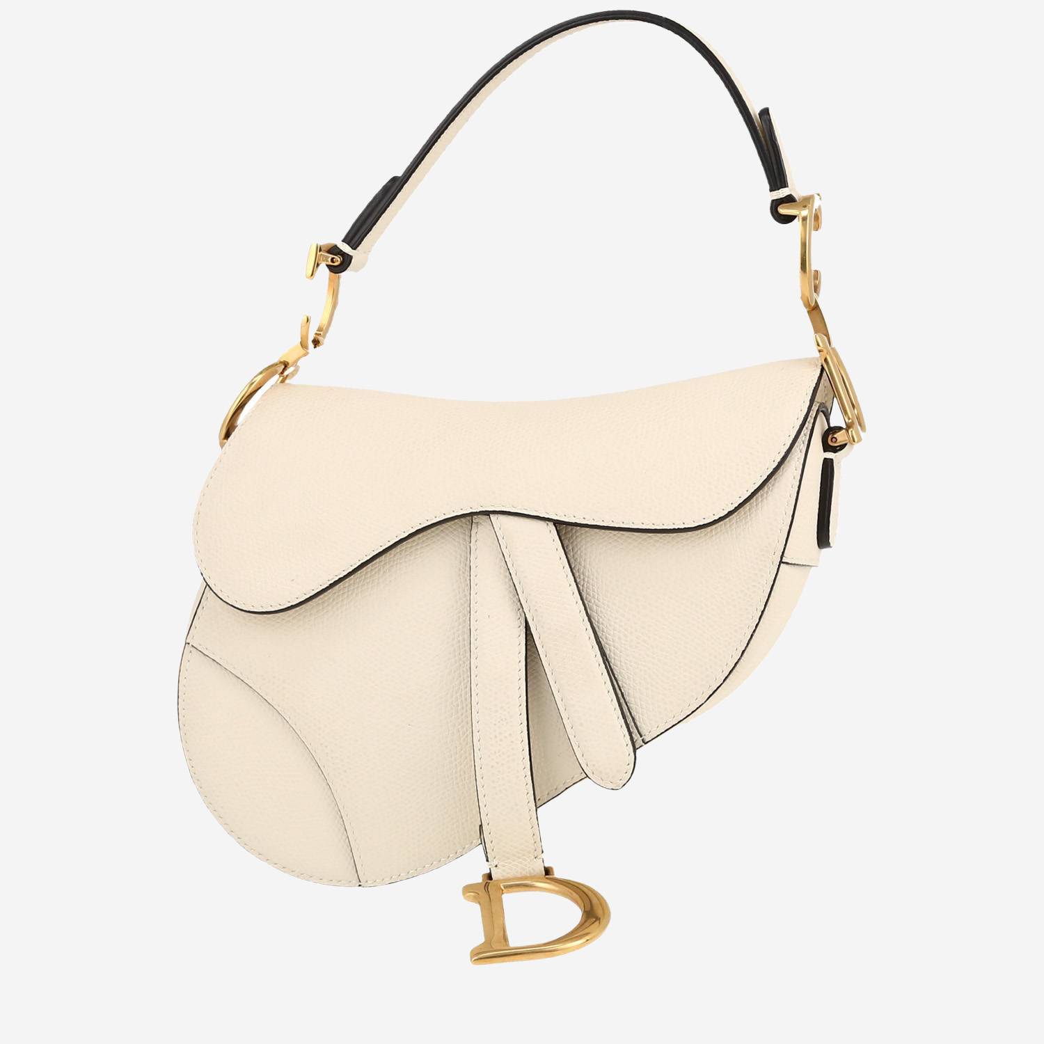 Splendide sac à main Dior Saddle petit modèle en cuir grainé écru, garniture en métal doré, poignée simple en cuir écru permettant un porté main ou épaule.