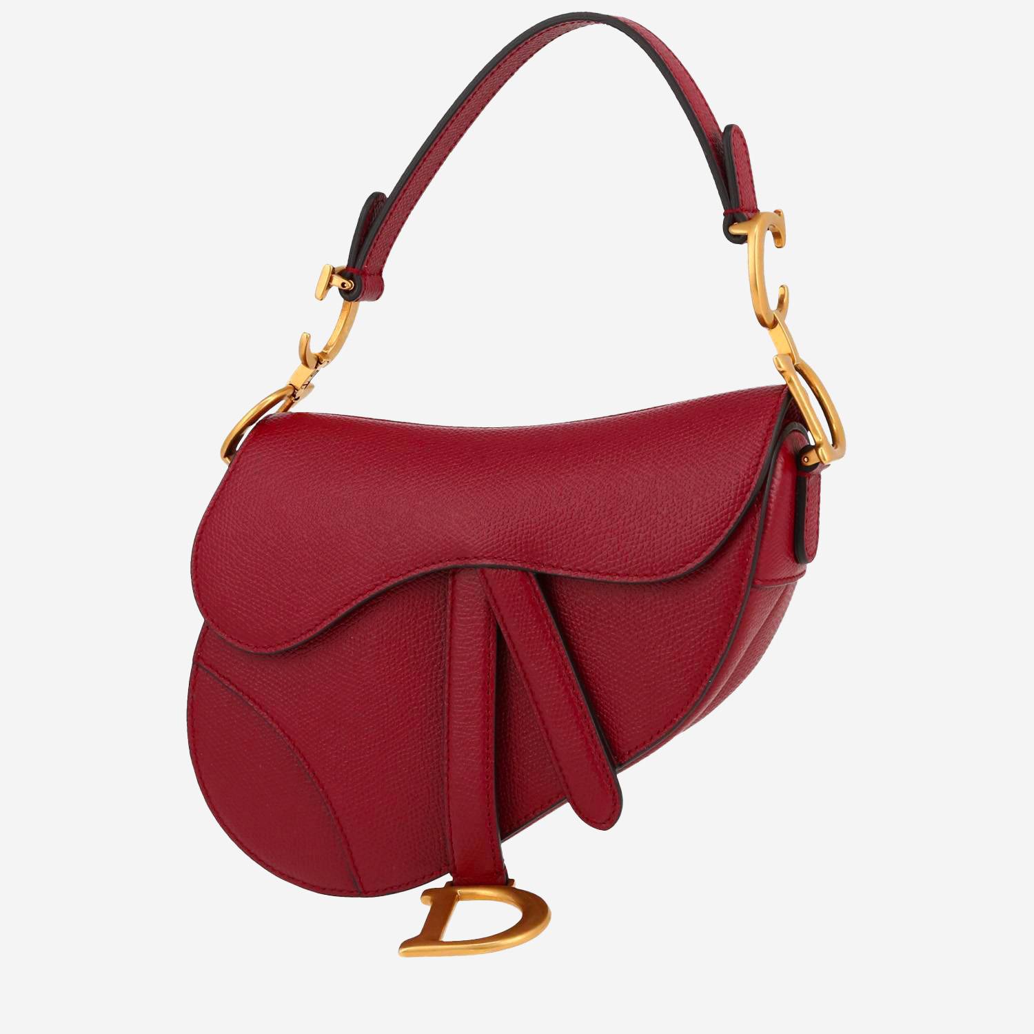 Splendide sac à main Dior Saddle petit modèle en cuir grainé rouge, garniture en métal doré, poignée simple en cuir rouge permettant un porté main ou épaule.
