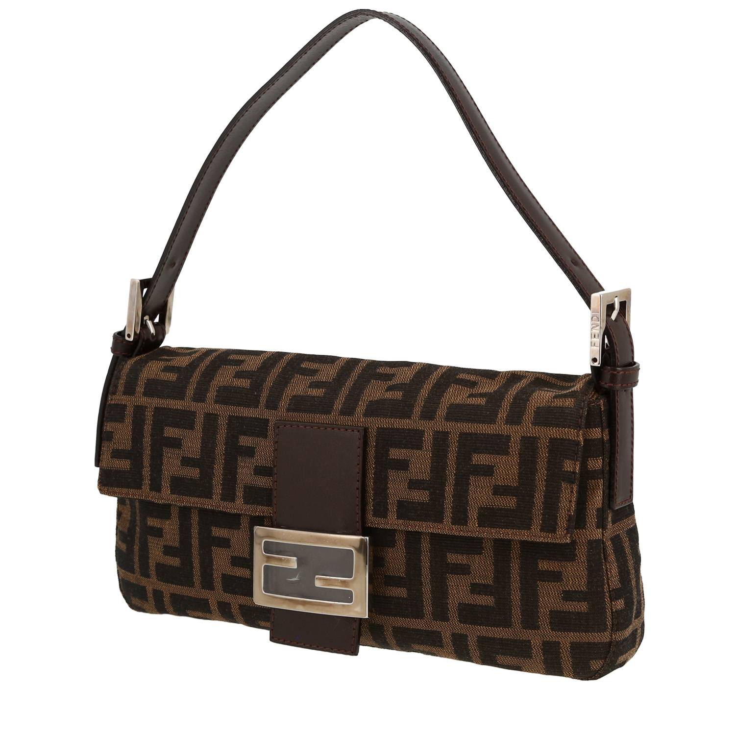 Incontournable sac à main Fendi Baguette en toile siglée marron et cuir marron, garniture en métal argenté, une anse simple réglable en cuir marron permettant un porté main ou épaule.