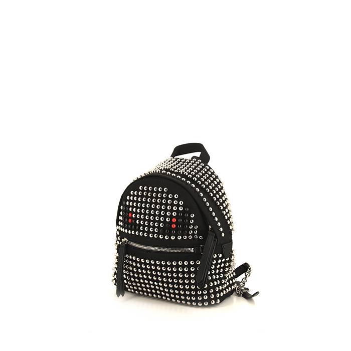 Amusant sac à dos Fendi petit modèle en toile noire décor de clous, garniture en métal argenté, poignée en toile noire, deux anses ajustable en cuir noir permettant un porté main ou dos.