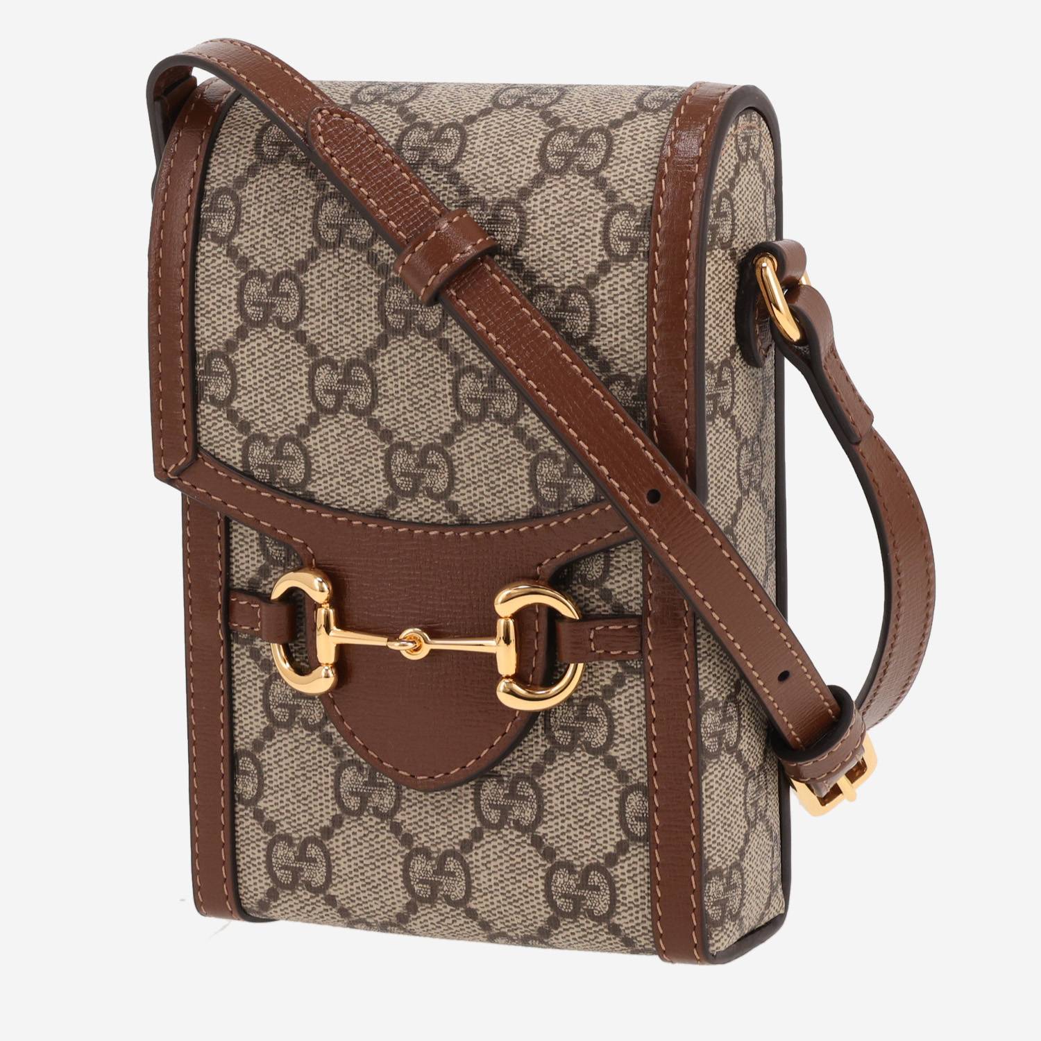 Amusant sac bandoulière Gucci 1955 Horsebit en toile sûpreme GG beige et cuir marron, garniture en métal doré, anse bandoulière en cuir marron permettant un porté épaule ou bandoulière.