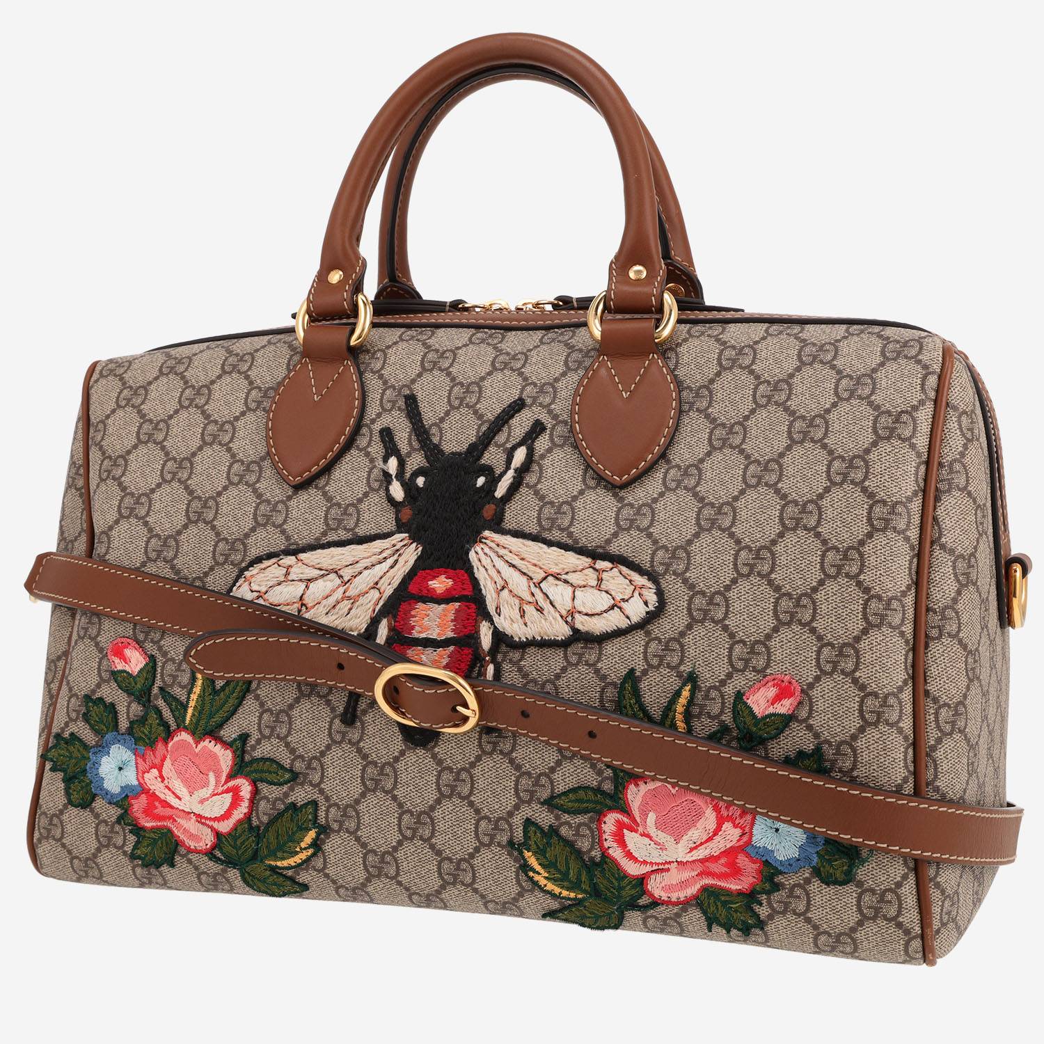 Exceptionnel sac à main Gucci Boston en toile sûpreme GG beige à motif et cuir marron, garniture en métal doré, double poignée en cuir marron, anse bandoulière ajustable en cuir marron permettant un porté épaule ou bandoulière.