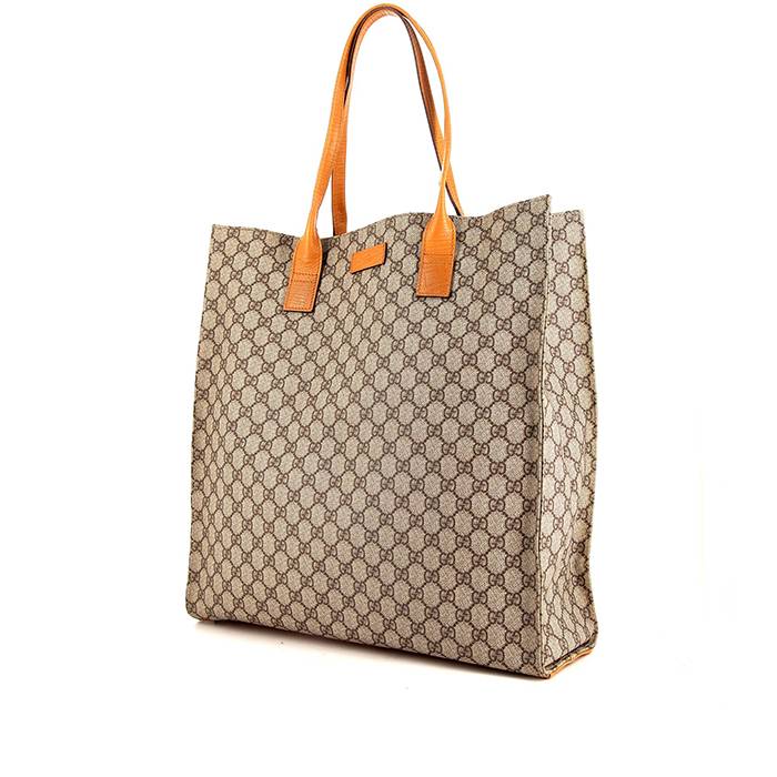 Élégant sac à main Gucci en toile monogram beige et cuir orange, garniture en métal argenté, double poignée en cuir orange permettant un porté main ou épaule.
