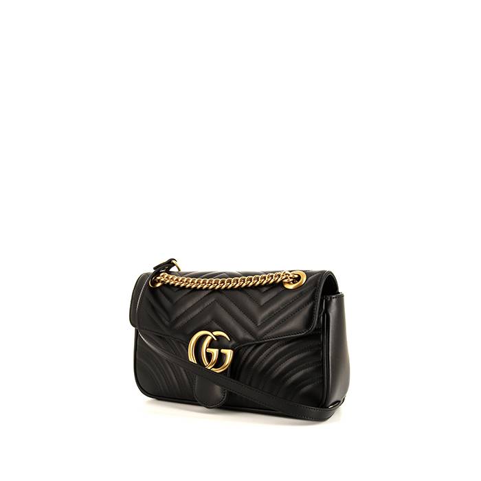Célèbre sac bandoulière Gucci GG Marmont petit modèle en cuir matelassé noir à décors géométriques, garniture en métal doré, anse-chaine en métal doré permettant un porté épaule ou bandoulière.