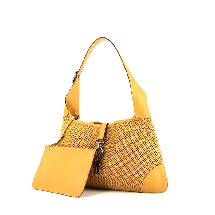Étonnant sac à main Gucci Jackie en cuir jaune à motif perforation et cuir jaune, garniture en métal argenté, une anse en cuir jaune permettant un porté main ou épaule.
