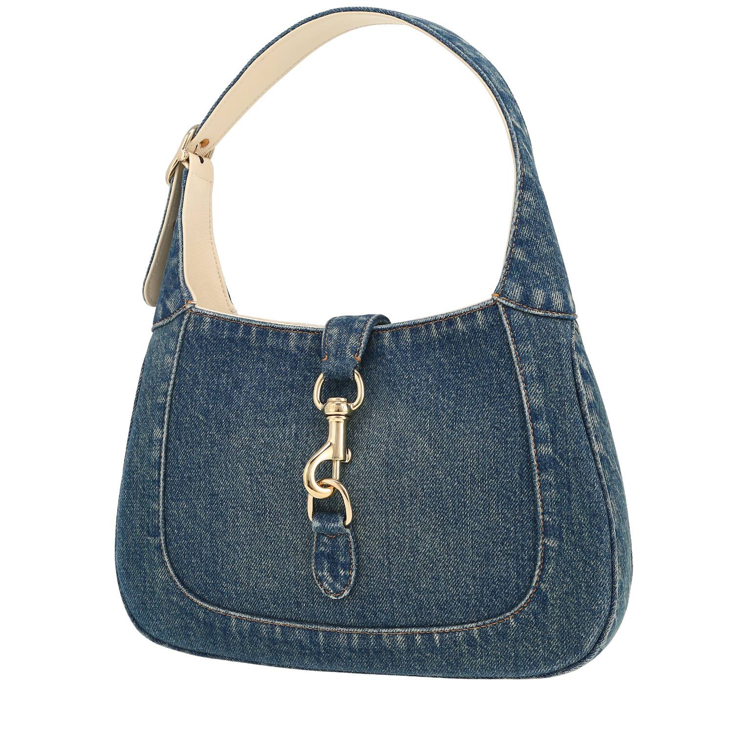 Charmant sac bandoulière Gucci Jackie en toile denim bleu, garniture en métal doré, une anse en toile denim bleue, anse bandoulière en toile denim bleue permettant un porté main ou épaule ou bandoulière.