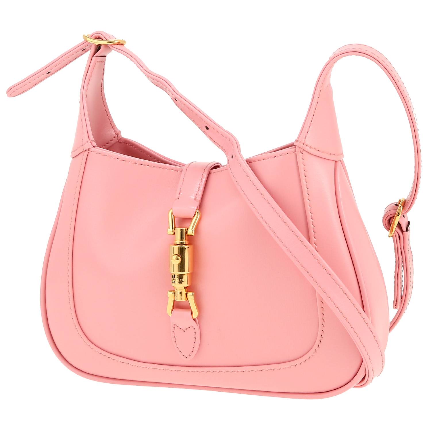 Magnifique sac bandoulière Gucci Jackie mini en cuir rose, garniture en métal doré, une anse transformable en cuir rose permettant un porté main ou épaule ou bandoulière.