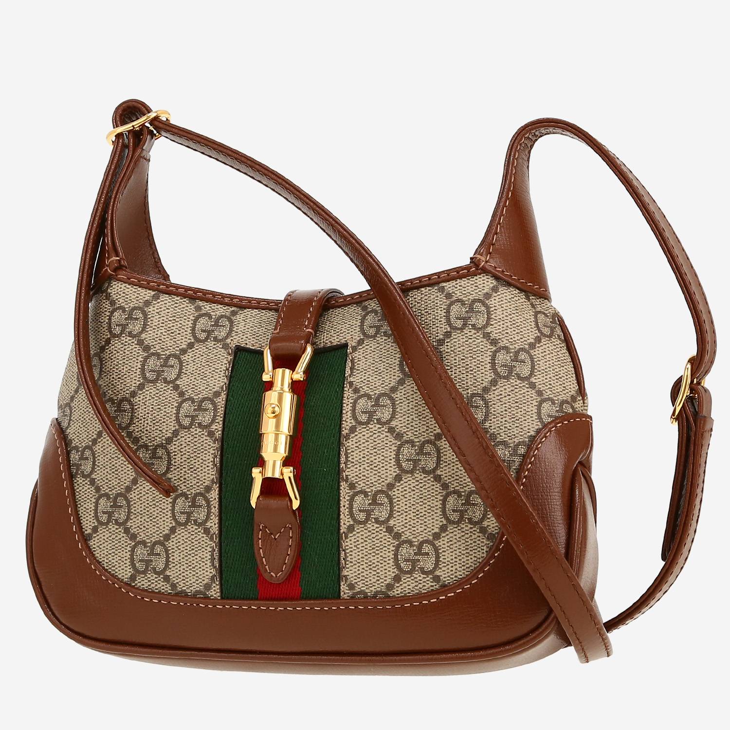 Magnifique sac bandoulière Gucci Jackie mini en toile sûpreme GG beige et cuir marron, garniture en métal doré, une anse transformable en cuir marron permettant un porté main ou épaule ou bandoulière.