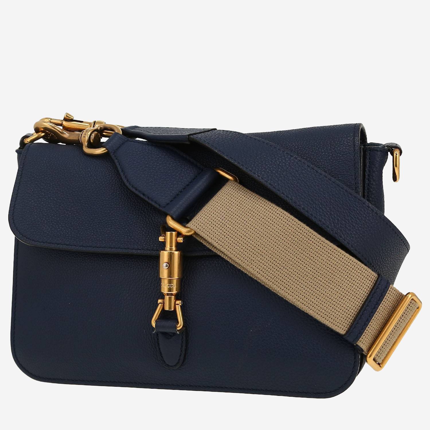 Magnifique sac bandoulière Gucci Jackie Soft en cuir grainé bleu, garniture en métal doré, une anse en toile beige, anse bandoulière amovible en cuir bleu permettant un porté épaule ou bandoulière.