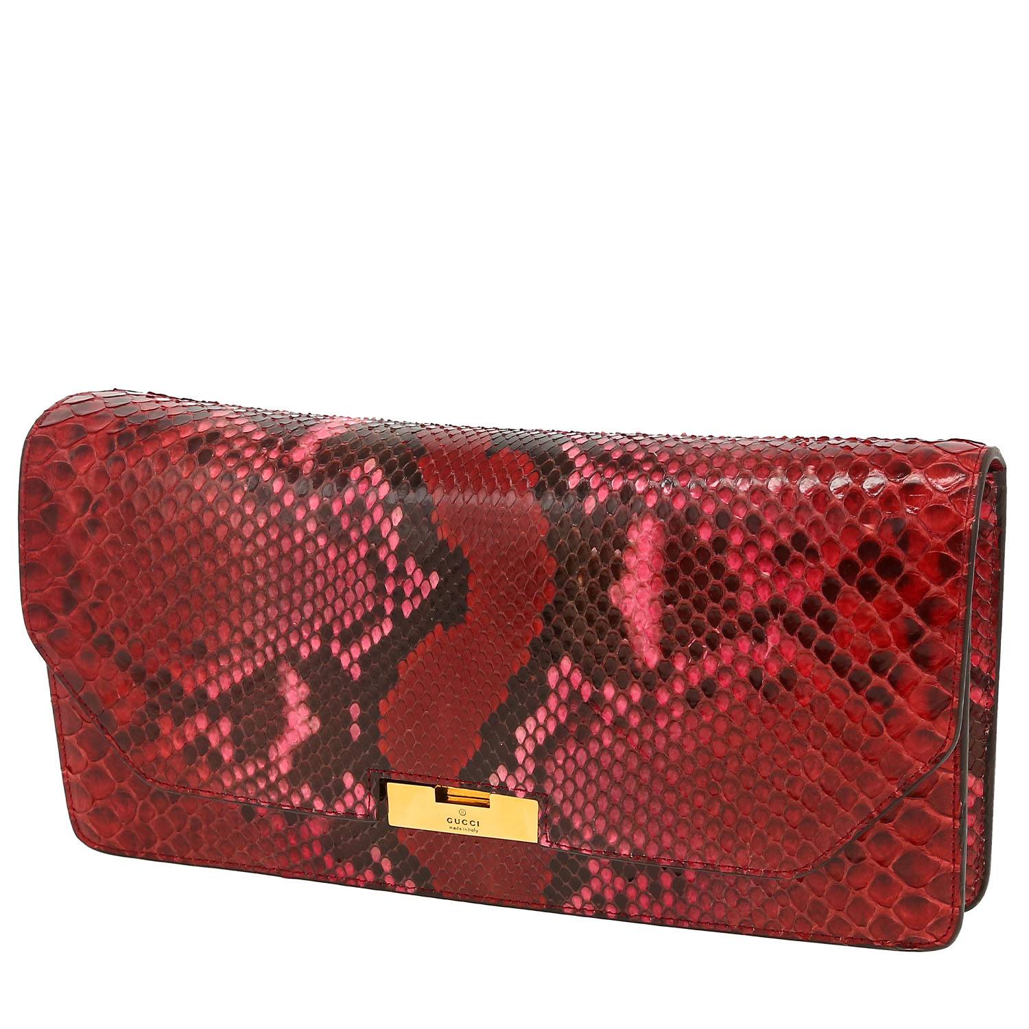 Magnifique pochette Gucci en python rose et rouge, garniture en métal doré.