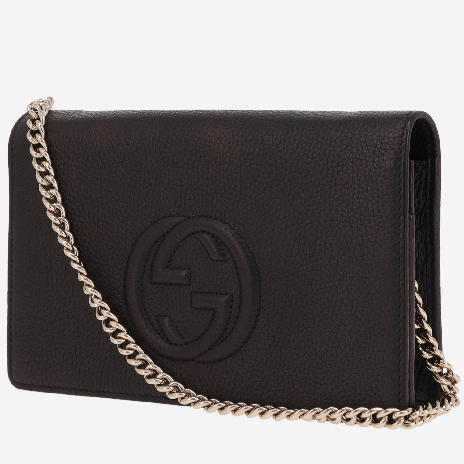 Magnifique sac bandoulière Gucci Soho en cuir grainé noir, garniture en métal doré, une anse-chaine en métal doré permettant un porté épaule ou bandoulière.