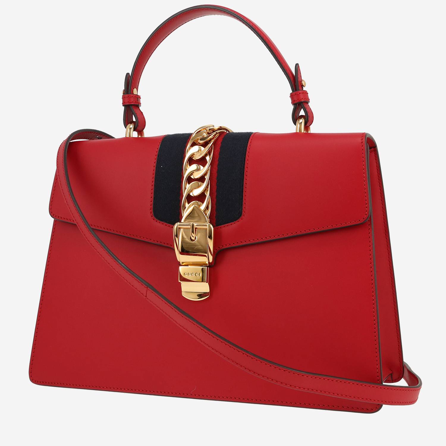 Magnifique sac à main Gucci Sylvie en cuir rouge, garniture en métal doré, poignée simple en cuir rouge, une anse bandoulière en cuir rouge permettant un porté main ou épaule ou bandoulière.
