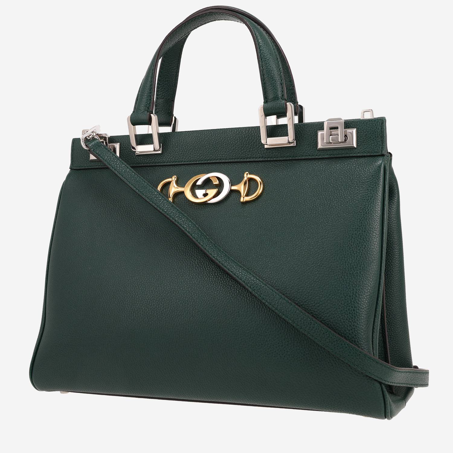 Magnifique sac à main Gucci Zumi en cuir grainé vert, garniture en métal doré et argenté, double poignée en cuir vert, anse bandoulière amovible réglable en cuir vert permettant un porté main ou épaule ou bandoulière.