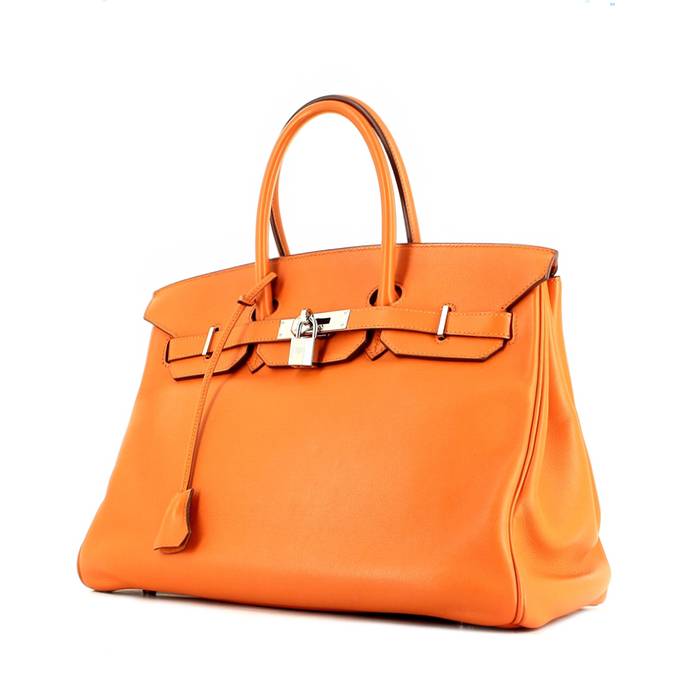 Joli sac à main "Birkin 35 cm" en cuir Swift orange, garniture en métal palladié, double poignée en cuir orange permettant un porté main.