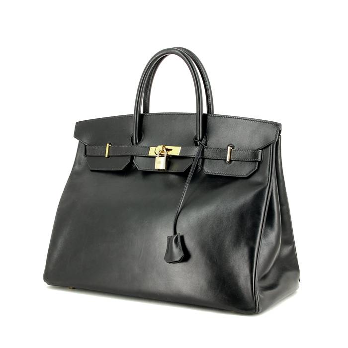 Ravissant sac "Birkin" 40 cm en cuir box noir, garniture en plaqué or, double poignée.