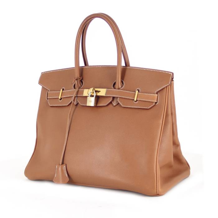 Splendide sac à main "Birkin" 35 cm en cuir gold, garniture en métal doré, double poignée.