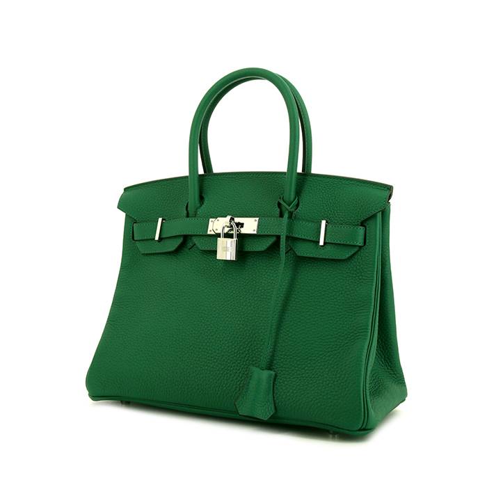 Superbe sac à main Hermes Birkin 30 cm en cuir togo vert, garniture en métal palladium, double poignée en cuir vert permettant un porté main.