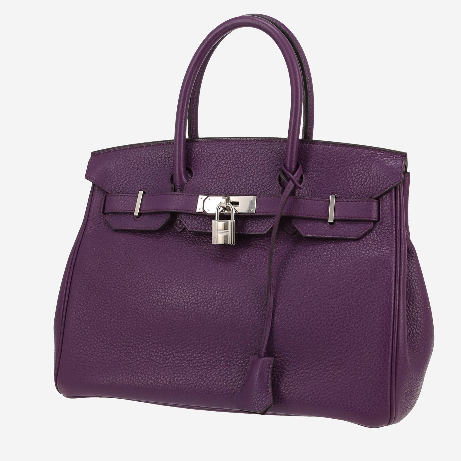 Magnifique sac à main Hermès Birkin 30 cm en cuir togo violet, garniture en métal palladié, double poignée en cuir violet permettant un porté main.