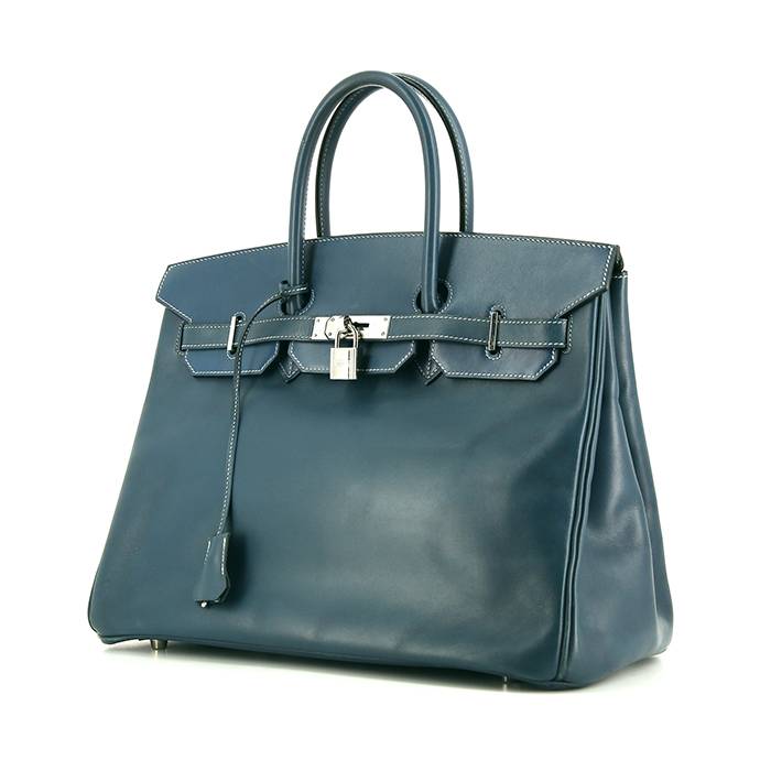 Charmant sac à main Hermes Birkin 35 cm en cuir box bleu, garniture en métal palladié, surpiqures blanches, double poignée en cuir box bleu permettant un porté main.