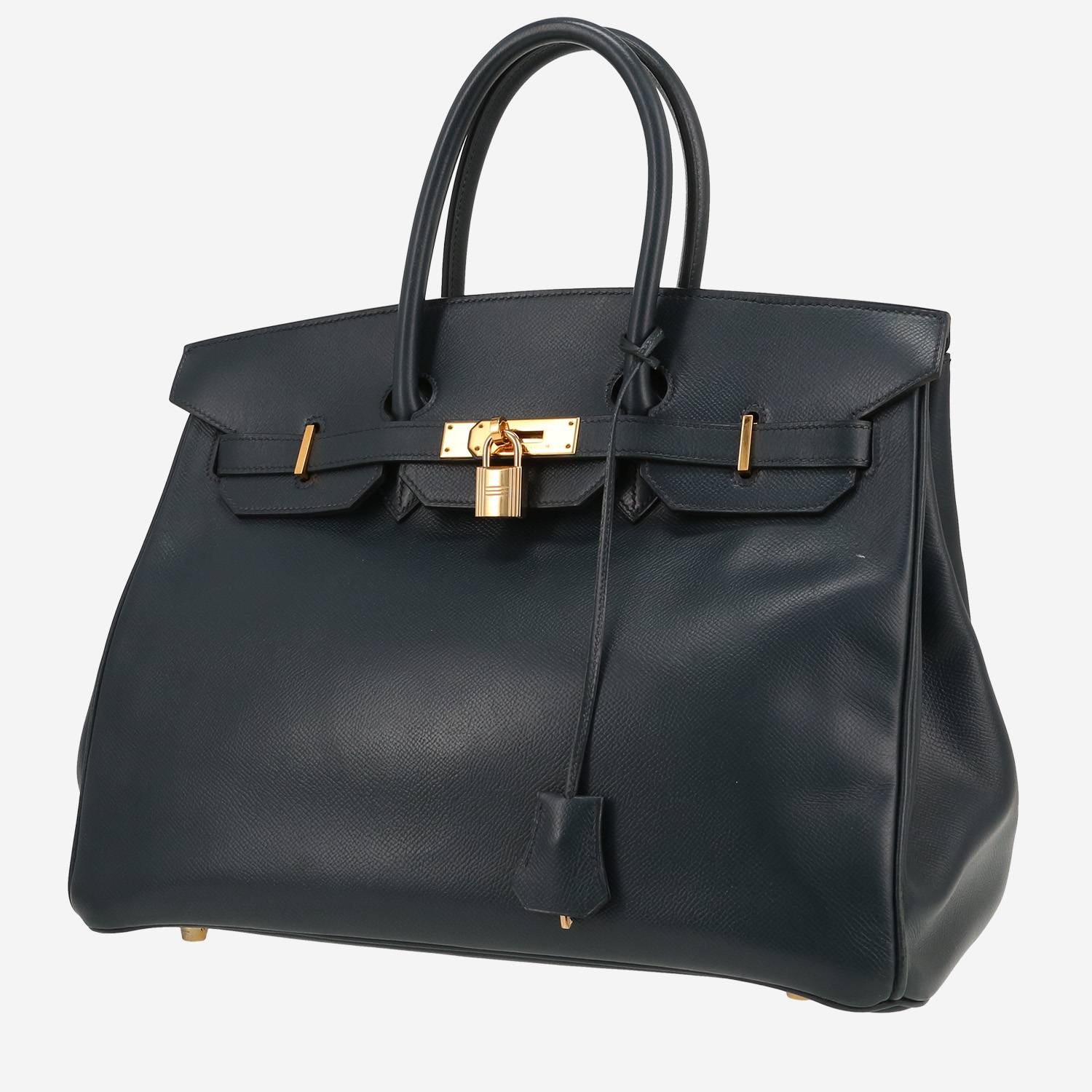 Magnifique sac à main Hermès Birkin 35 cm en cuir Courchevel bleu indigo, garniture en métal doré, double poignée en cuir bleu indigo permettant un porté main.