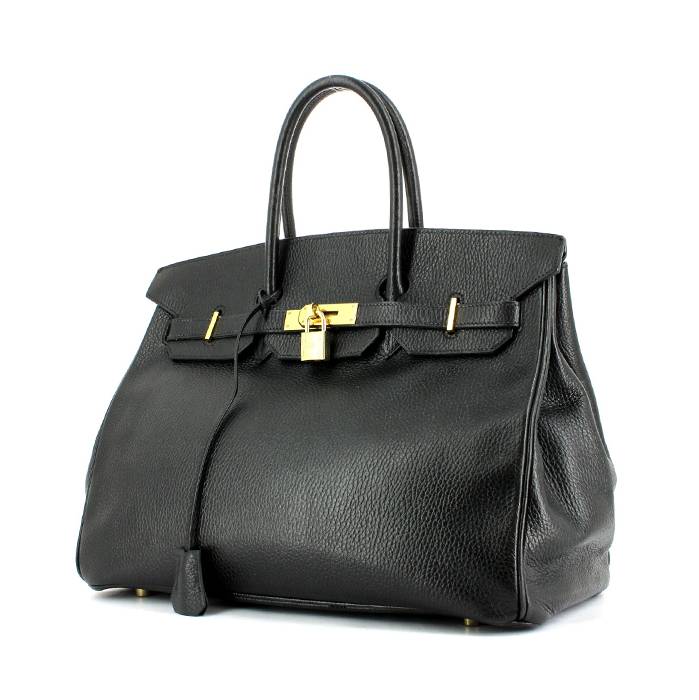 Délicat sac à main "Birkin 35 cm" en cuir Fjord noir, garniture en métal doré, double poignée en cuir noir permettant un porté main.
