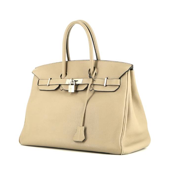 Élégant sac à main Hermes Birkin 35 cm en cuir togo gris-tourterelle, garniture en métal palladium, double poignée en cuir gris-tourterelle permettant un porté main.