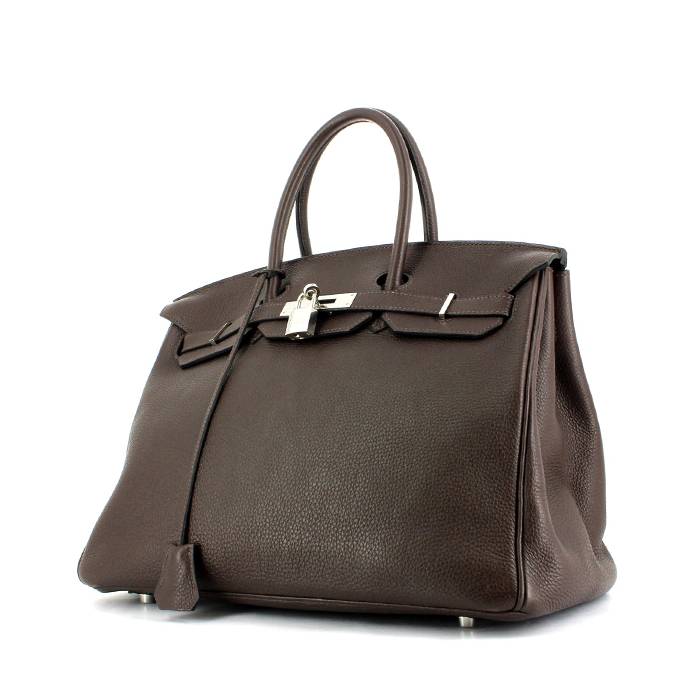 Charmant sac à main "Birkin 35 cm" en cuir togo marron, garniture en métal palladium, double poignée en cuir marron permettant un porté main.